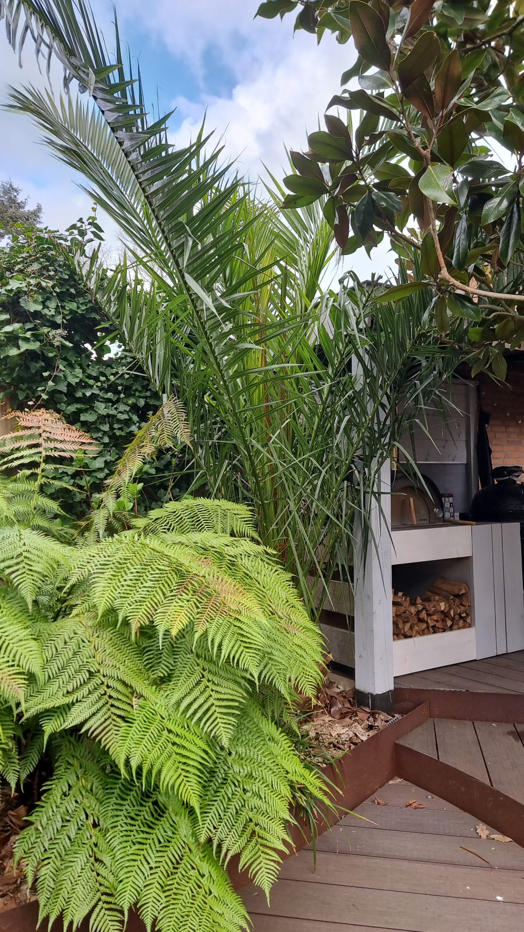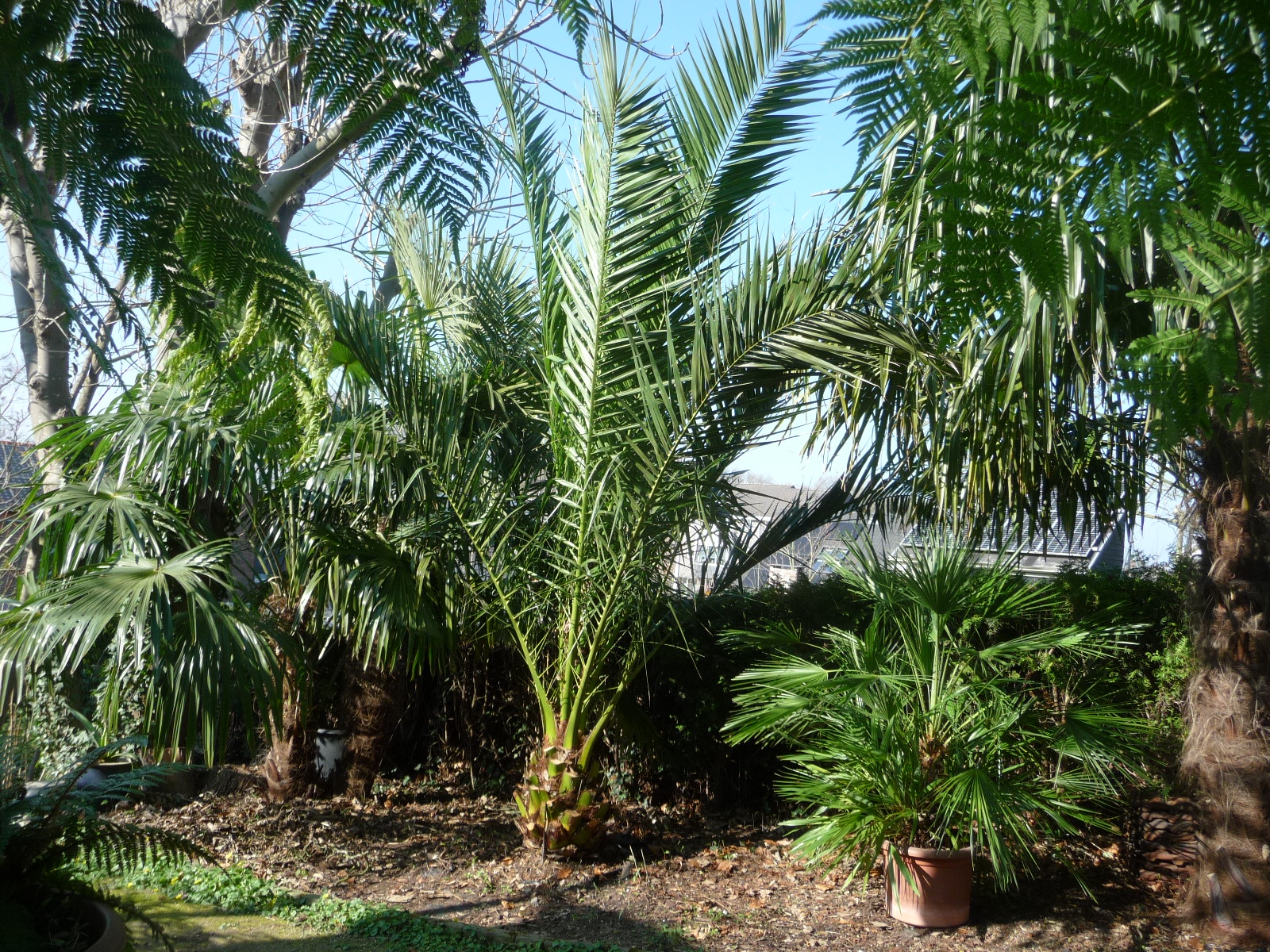 Bescherming dit jaar was zoals ik het met al mijn kwetsbare palmen doe: inwikkelen met jute, daaromheen warmtelint, daaromheen een koker van doorzichtig golfplaat. In dit geval van de rol 4 m hoog. Opening aan de onderkant en bovenin aan de zijkant voor de ventilatie.