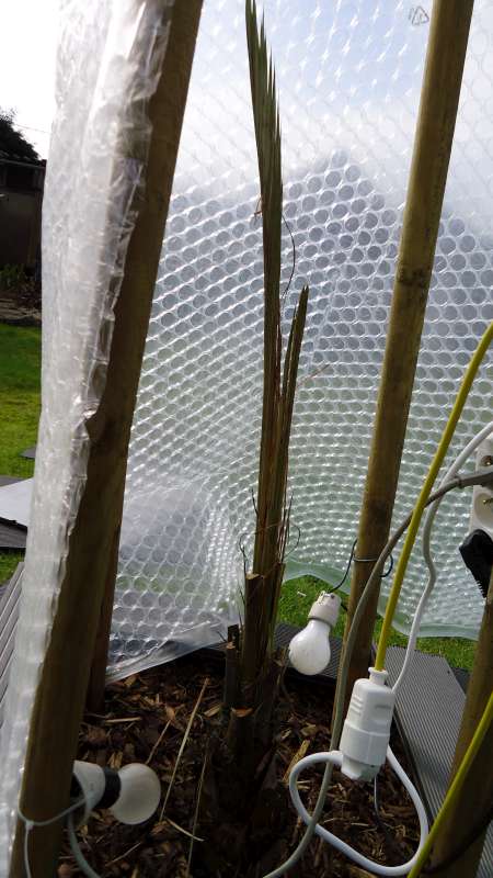 Bedankt voor de tip maar die warmtekabel geeft echt zo miniem warmte dat me dat zou verbazen. Hij heeft het erg lang goed gedaan maar natuurlijk op de koudste nacht viel de boel plots uit door een probleem met de thermostaat. Hij heeft die nacht -10 gehad en dan nog ongeveer een halve ijsdag er boven op. Toen is de verkleuring opgetreden en gingen de bladeren sterk achteruit. Ik heb dan alles op een andere thermostaat gehangen maar het kwaad was al geschied. Ik was er eigenlijk van overtuigd dat de hele palm om zeep was tot ik gisteren de tent opende en de stevige groene speren zag zitten.