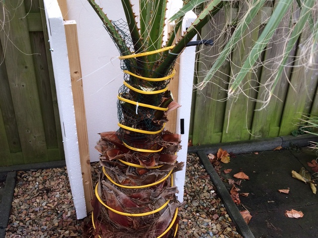 Vorige winter was ik erg tevreden over de bescherming die ik had aangebracht. Alle reden dit te herhalen. Vandaag heb ik laatste voorbereidingen getroffen. De Washingtonia R. was enorm gegroeid dit jaar, dus allereerst moest ik overtollig blad verwijderen. De verwarmingskabel aangebracht en als laatste een stevige behuizing geplaatst van 5cm dikke styropor platen. Bij de eerste de beste vorst van betekenis is het slechts nog een kwestie van de hoes er overheen trekken.
