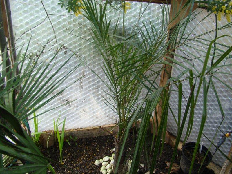Van zodra hij goed is aangeslagen kan je hem wel vergelijken met een phoenix denk ik. De eerste winter is altijd het moeilijkste, maar dat is ook zo voor andere palmen in de volle grond. Ik heb wel een exemplaar kwijtgespeeld, waarschijnlijk door een te natte standplaats. Deze op de foto ( die ook speerrot gehad heeft, maar hersteld ) krijgt de ganse winter geen druppel water, net zoals alle andere planten in hun winterbeschermingen.