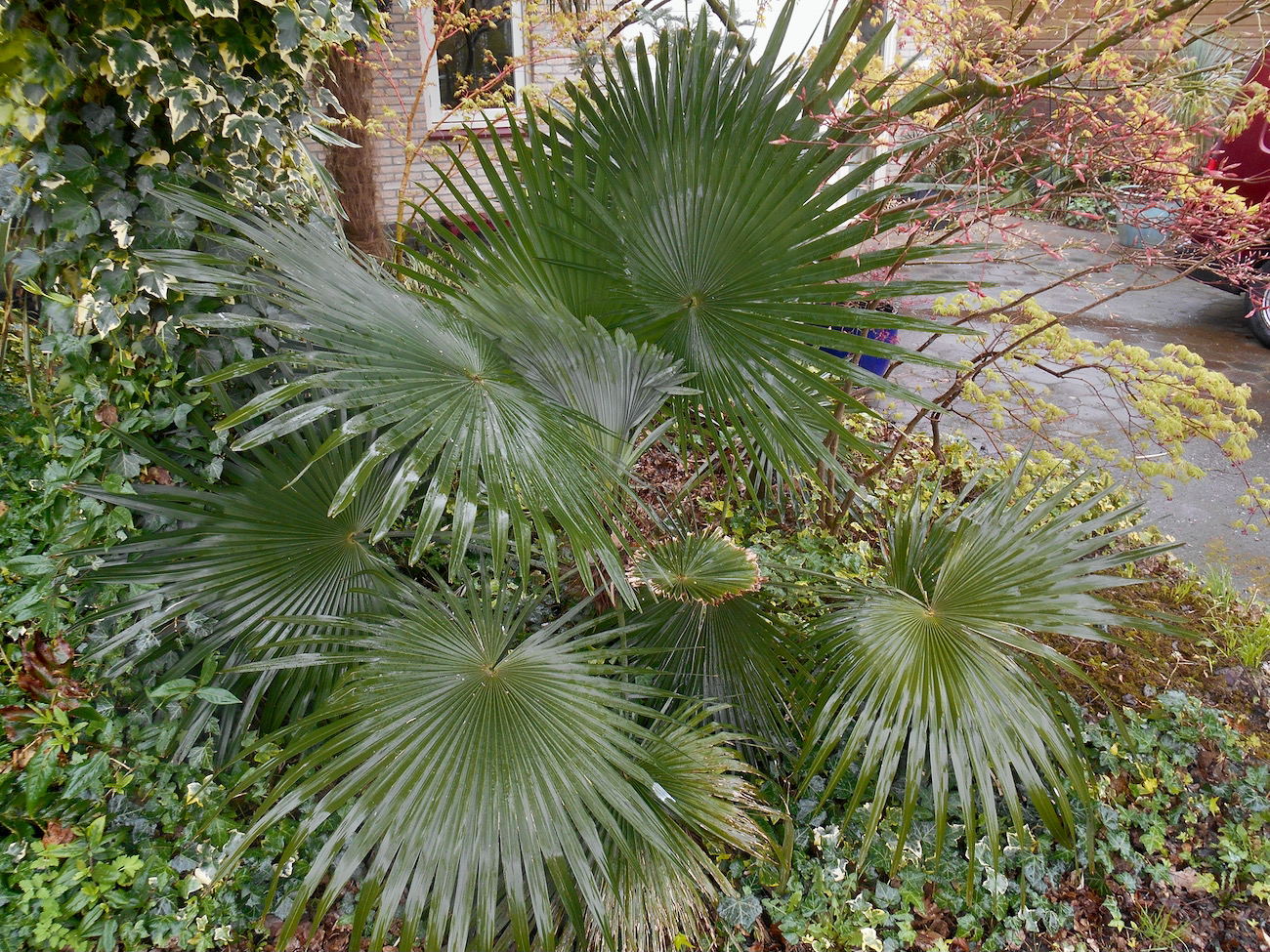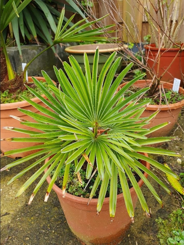 'Mijn' beide princeps komen van Gardenpalms een jaar of 17 geleden. (a) is meteen uitgeplant en verloor een paar maal z 'n kroon het laatst in 2012. (b) is 5 jaar geleden uitgeplant. Of de zaden uit Stonegate afkomstig waren of een ander gat, weet ik niet? Meest opvallend vind ik de grote regelmatig verdeelde bijna cirkelronde bladspiegel. De witte onderzijde is goed te zien als je er in het donker met een zaklantaarn opschijnt. Ook andere Trachycarpus reflecteren het licht in meer of minder mate.