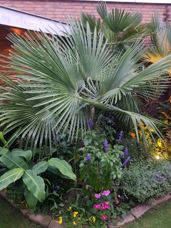 Vandaag nog weer even een vergelijking gedaan tussen de echte princeps (midden) de New Form (links) en de ukhrulensis (Manipur) op rechts. Op dit moment hebben de eerste twee exact vijf bladeren gemaakt dit jaar en staat de zesde op het punt te ontvouwen. Het is bizar om te zien hoe de groeisnelheid van beide planten nu de afgelopen vier jaar exact even snel is. Wat aantallen bladeren betreft en het moment van uitvouwen hiervan verschillen ze echt niets. Opvallend verschil is wel de ontwikkeling van de stam. Van de New Form is deze nu 110 cm lang en van de princeps is dit nu 90 cm. Daarmee heeft de New Form de echte ruimschoots ingehaald. De New Form staat sinds april 2016 in de volle grond, de princeps sinds 2009. Ook is de stamdiameter van de princeps groter, gemiddeld een dikke 20 cm. Van de New Form is dit iets minder dan 20 cm. Als laatste zag ik ook dat de bladslippen van de New Form nu bijna 90 cm lang zijn tegen een kleine 85 cm van de echte princeps.