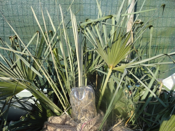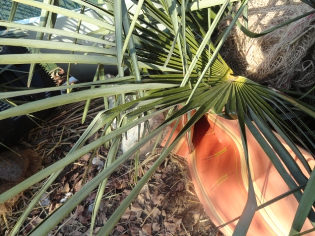 De potten met Chamaerops humilis die ik in de blokhut heb staan zijn nog vervroren.