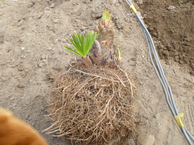 Als je de laatste mogelijkheid toepast en dus de stam gaat afzagen dan meet je de diepte van het gat door middel van er een stokje in te steken. Niet drukken zodat je het eventuele aanwezige palmhart niet doorboort natuurlijk ! Dan hou je het stokje naast de stam en weet je waar je moet zagen. De zaag erin of ik gebruik de slijpschijf