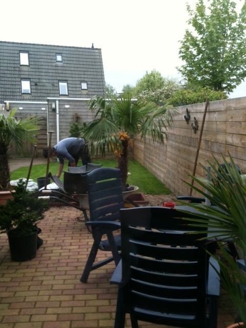De grote heb ik dit jaar gekocht bij tuinland en deze is dus na aankoop direct de volle grond in gegaan. Met dit mooie weer geef ik de palmen om de dag, s'ochtends, 10 liter water en om de twee a drie weken geef ik ze wat koemest opgelost in water.Nu de vragen,