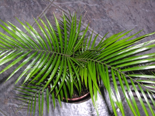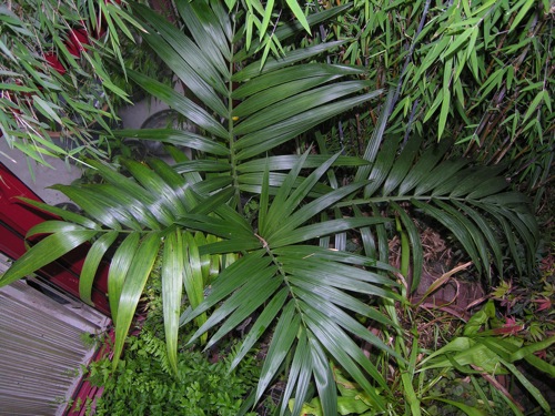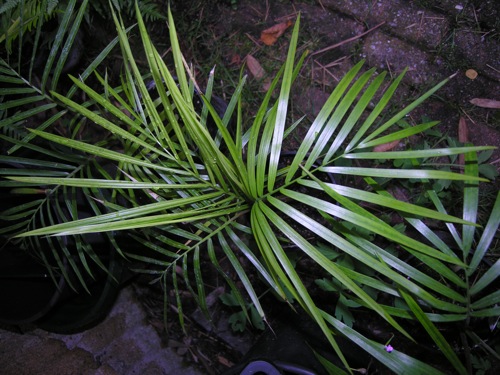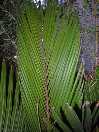 Het is blijkbaar moeilijker dan ik dacht, Het eerste blad is van Howea forsteriana en het tweede van Rhopalostylis sapida. De roodbruine tint bij de Howea is een variatie die nu en dan opduikt. Deze variant is ook te herkennen aan de purperkleurige bladstelen. Het volwassen blad is lichter groengetint dan bij de 'groene' vorm. De sapida is via Ponga Treeferns bij mij terechtgekomen, geïmporteerd uit Nieuw Zeeland.