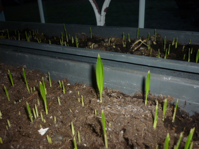 hallo ;maar goed dat ik ze heb binnen geplaatst er is al flink wat opkomst te zien van trachy zaailingen .om welke soort trachy het gaat weet ik niet ze werden per tros (1080 zaden )verkocht als decoratie materiaal voor maar 7.50. de mevrouw van de bloemenwinkel zei dat het van een dadelpalm was ik denk dat ze veel geld waard zullen zijn ;de eerste trachys met dadels