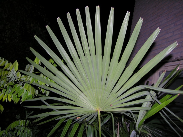 De princeps hybride is dit niet, die heeft nog geen stam. Deze Trachycarpus viel mij op doordat de palm in een eikenhouten kuip stond en vanwege het relatief korte stevige blad. De meeste Trachycarpus hebben wel een weerschijn aan de onderzijde maar minder uitgesproken als bij een princeps of manipur. Het flitslicht speelt hierbij ook een rol.