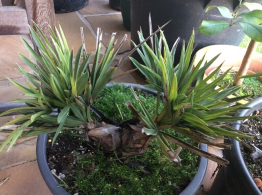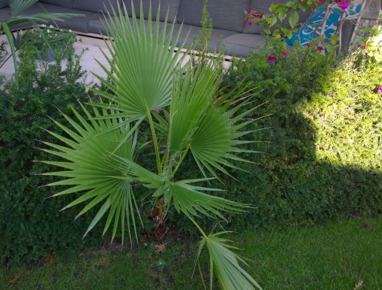Hoi Herman, dank je. De Trithrinax staat pal op het zuiden vlakbij de voorgevel, een warme bakstenen muur. Droog ook daardoor. Water geven doe ik niet bij deze soort. Hij blijft bij mij ook wat gedrongen, maar de kleur is goed en iedere kant heeft dit jaar vier bladeren gemaakt. kijk maar naar de fotos, de eerste is van augustus 2013. Daar zie je wat bladeren met lange bladslippen, maar die zijn binnen aangemaakt. De rest is allemaal puur buitenblad. Ik heb m in juni 2013 geloof ik uitgeplant. De tweede foto is dus heel recent. Heel ander blad, korter, gedrongen, maar zeer scherp/puntig en fraai staalblauw.