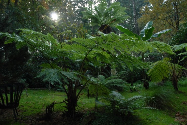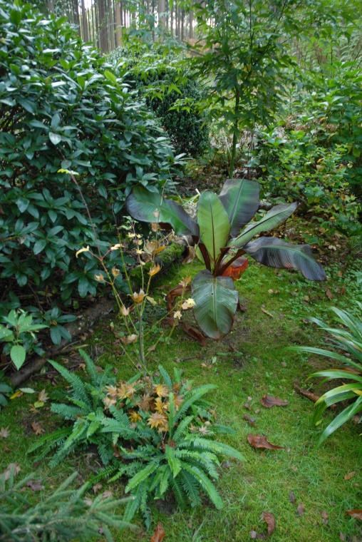Dit mooie najaar levert leuke plaatjes op die inheemse planten rond deze tijd laten "blozen". Door het mooie najaarsweer is het gewoon extra genieten van palmen, varens en zelfs bananen. Bijgaand wat plaatjes van een groene tuin bij mij in het bos. De meeste bladeren zijn reeds gevallen van inheemse loofbomen en hosta's zie ik ook al lang niet meer maar hiervan wordt ik vrolijk elke keer als ik weer thuis kom (alleen zo jammer dat het weer zo snel donker is)