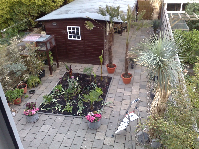 Die plank dient om een potgedrukte palm met uitgestoken wortels te stabiliseren. Na een volledig seizoen zou ik een gezonduitziende palm wel aandurven zeker met een forse najaarskorting. De wagnerianus vrouw die vorig jaar zo 'n 4000 zaden produceerde was zo 'n 50% geval. De aangekochte verwekker echter viel om uit de kuip toen ik deze in de auto wilde laden. Ik was blijkbaar verblind door de krachtige uitstraling van deze palm. Daarbij brak een aantal van de nieuwgevormde wortels af. Opnieuw en strakker opgepot, herstelde de palm echter volledig en hangt deze nu weer vol met bloemtrossen. Het zijn taaie rakkers.