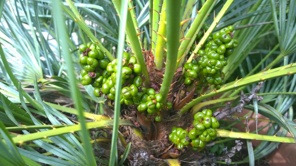 Bij Chamaerops 'Arborescens' hier is het een jaarlijks weerkerend verschijnsel. Het heeft nog nooit wat opgeleverd. De zaden krijgen een flink formaat, worden bruin en verdrogen tenslotte. Een handmatige bestuiving van de Cerifera met pollen van een groene man leverde vorig jaar kiemkrachtig zaad op. De vrouwelijke wagnerianus heeft ook meerdere bloeiwijzen gevuld met vitaal uitziende zygotes. De mannelijke plant die in 2013 voor ±4000 zaden zorgde, bloeide dit jaar veel te vroeg en dat gold ook voor de overige mannelijke Trachy's. Er staan wel een aantal volwassen exemplaren Trachycarpus verderop in de straat in achtertuinen. Maar ik kan me moeilijk voorstellen dat dit tot een dermate effectieve bevruchting zou kunnen leiden.