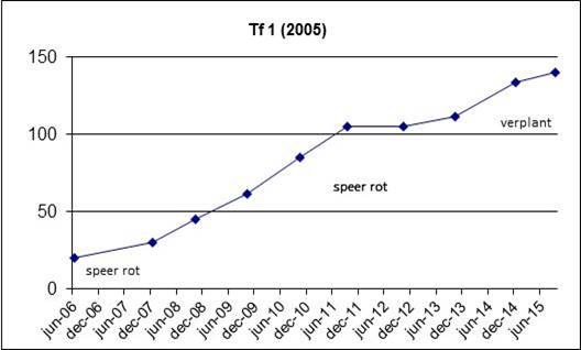 Groei is behoorlijk constant, bij speerrot en verplanten wat groeivertraging uiteraard.