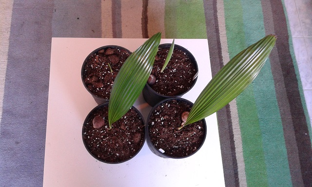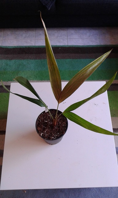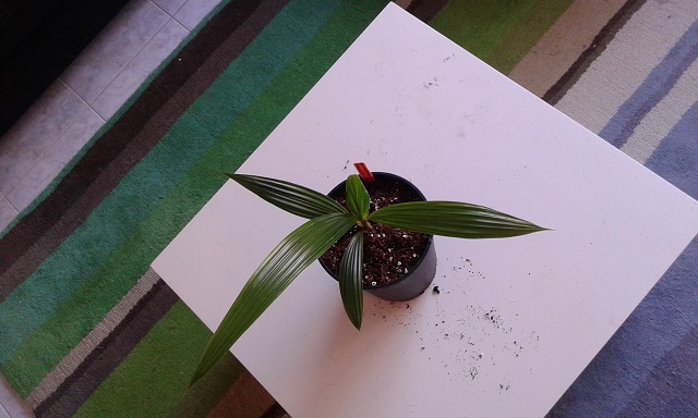 Als je kijkt naar waar deze soort vandaan komt en wat voor constant klimaat zijn genen op zijn afgestemd, is het verwonderlijk te noemen dat de plant uberhaubt langer dan een paar maanden na ontkiemen blijft leven in een huiskamer. Toch is het zo. Omdat ik eind 2012 gratis zaden bij RPS mocht uitzoeken, heb ik onder andere een zakje van 10 van deze rakkers laten komen uit Duitsland. In mijn vorige leven in Zeeland heb ik deze soort eerder gehad met veel succes, maar ja, daar had ik ook werkelijk een Sechelliaans klimaat in mijn huiskamer gecreeerd. Ditmaal zouden ze het in een normaal 20 C, drogelucht huiskamer moeten gaan doen. Maar goed, met wat gratis zaden wil je nog best wel eens wat experimenteren. Kieming is bij deze prachtige zaden een kwestie van enkele weken en ze groeien erg snel (voor palmen dan).