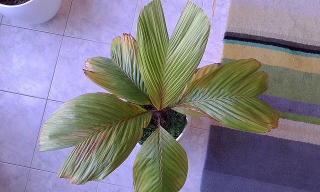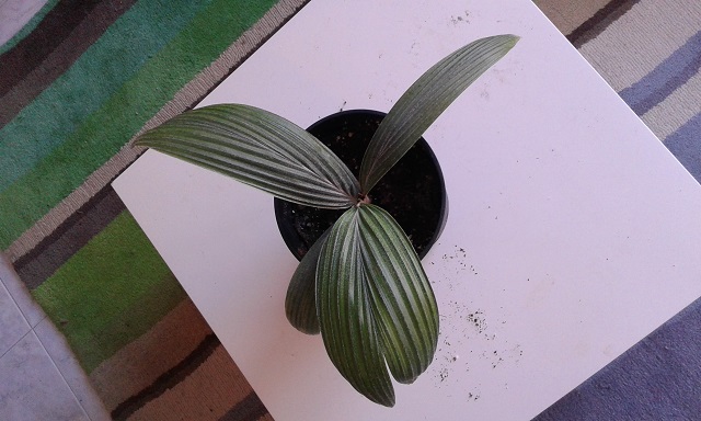 Een tijdje geleden besloot ik uit ruimtegebrek de Verschaffeltia's onder te brengen in een verwarmde kas. Dat ging in het begin goed en de groei nam behoorlijk toe. In no-time waren het flinke planten, tot ik op een bepaald moment een telefoontje kreeg dat het slecht ging met de planten. Ik heb toen alles terug naar huis gehaald. Het blad was behoorlijk verbrand door iets, maar het verhaal dat de luchtvochtigheid te hoog voor ze geweest zou zijn, gaat er bij mij niet in. Ik ben nog steeds bezig met de 3 planten die ik nog heb, op te lappen en dankzij de snelle groei gaat dat aardig. Toch duurt het wel even voordat ze er weer helemaal tiptop uitzien. Dit is de plant die ik in de huiskamer heb staann: