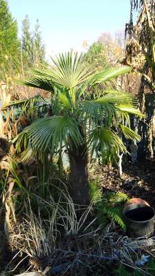 Die winter van 2009-2010 molde al mijn onbeschermde T. fortuneis in de tuin (alle andere palmsoorten in de tuin overleefden het niet) behalve... die palm uit Turkije. Deze was wel ook erg beschadigt (zie eerste foto) maar maakte dat jaar wel een nieuwe kroon aan al waren de nieuwe bladeren allemaal kleiner dan er bij aankoop op stonden. Hij heeft ook sinds dan nooit nog echt grote bladeren aangemaakt. Eigenaardig.
