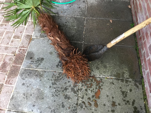 Op het moment dat ik de palm uit de pot wilde halen om in de volle grond te plaatsen ging dat heel makkelijk en alle potgrond ging eruit en de relatief zware kluit met klei bleef over. Voorzover je het een kluit mag noemen
