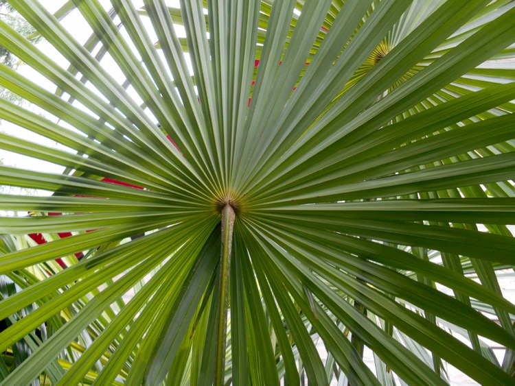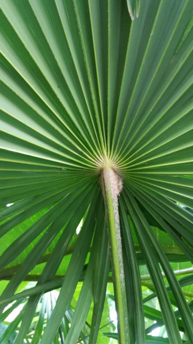 Met wat speurwerk en een dosis geluk kun je bij het reguliere aanbod palmen aantreffen met cirkelronde bladeren. Bij Trachycarpus fortunei is dit verschijnsel niet heel zeldzaam en heb ik deze vorm een drietal keren kunnen bemachtigen. Ook bij Chamaerops tref je deze cirkelronde bladeren soms aan. Daarentegen ben ik deze cirkelvorm bij een wagnerianus nog niet tegengekomen. Iemand anders wellicht? Bij het fortunei blad is de cirkel geheel rond en is zelfs sprake van een overlapping. De 48 segmenten bepalen een doorsnede van 120 cm. Bij een wagnerianus met ± 40 segmenten is de diameter omstreeks de helft.
