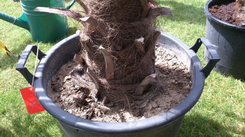 Dienen we deze palmboom dan best om te potten met potgrond? Of gaat deze palmboom de komende jaren ook verder overleven in deze pot met plastiek + kleigrond?
