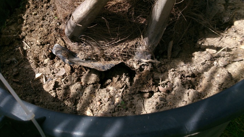 De koper kon ons echter niet meer informatie geven, maar de palmboom zit in een pot met kleigrond (vermoeden we). Daarnaast lijken de wortels van de boom omringd te zijn met een zwarte plastiek zonder gaatjes.