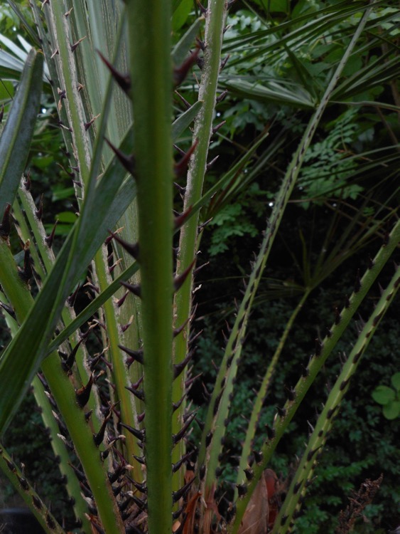 Dat laatste is ook mijn indruk vanaf deze afstand, Washingtonia heeft vrijwel altijd 'draden' langs bladsegmenten en de doorns zijn haakvormig terwijl de doorns bij Chamaerops recht zijn maar omdat ze onder een hoek staan geplaatst, minstens zo effectief zijn. ;)