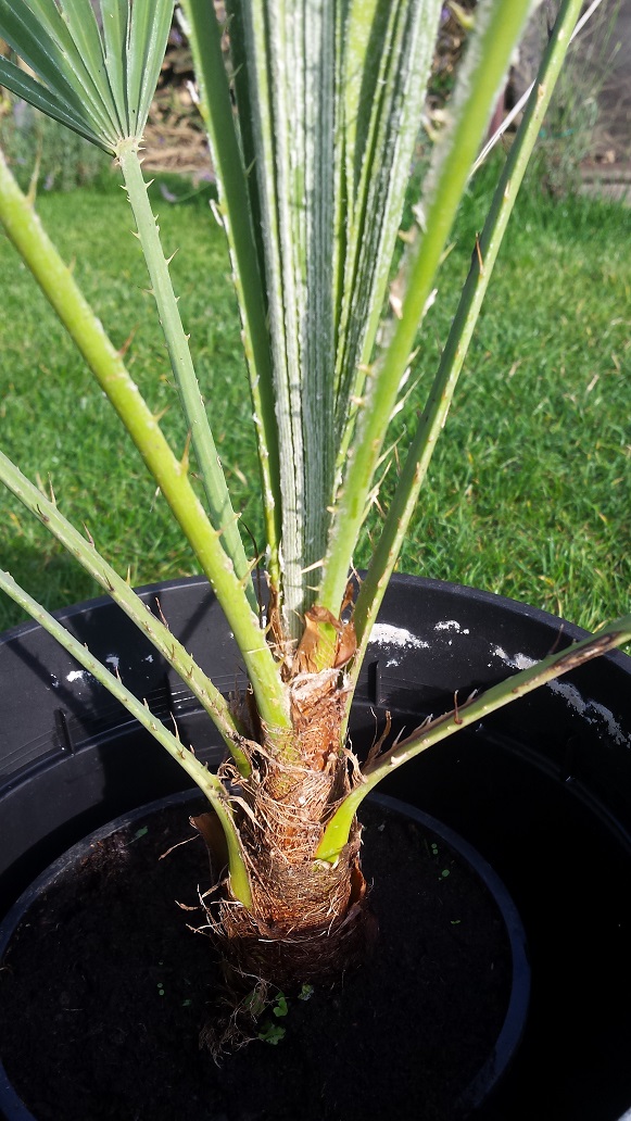 De doorns van Chamaerops zijn vrij karakteristiek en varieren in kleur van geel tot zwart. Ik heb snel een foto geschoten van mijn Cerifera. De palm rechts op de foto heeft vrijwel zeker enige tijd binnen gestaan gelet op de langgerekte bladstelen. Volgens Troy en ondergetekende is tenminste 1 palm fout gelabeld! Vergelijk voor zover mogelijk de doorns op de bladstelen want bij jonge palmen en weinig zonlicht zijn deze vaak nog zwak ontwikkeld. De kenmerkende afhangende draden bij Washingtonia filifera (de naam duidt hierop) zijn evengoed aanwezig bij een jonge robusta. De 2 soorten zijn daardoor als jonge plant moeilijk te onderscheiden, maar W. robusta is het meest voorkomend.