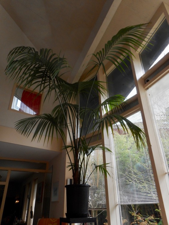 Ik heb deze fantastische palm weer eens even (letterlijk) in het zonnetje gezet, de relatief zeldzame natuurlijke variant met roodbruin nieuw blad. Voorlopig is het 's nachts nog te koud voor een standplaats buiten. Tijdens de overwintering hadden enkele solitaire dopluizen hun kans waargenomen. Ze verraden zich door hun uitwerpselen de zogenaamde honigdauw. Die heb ik met alcohol verwijderd plus de plak zodat ik het effect van de bestrijding kan controleren. Op het duo exemplaar zaten ook de karakteristieke schildjes. alleen was hier geen plak te bekennen en leken de schildjes leeg. Ik vraag me af of mogelijk parasitaire insecten me voor zijn geweest gedurende het verblijf van de palm vorige zomer in de tuin? Het getoonde exemplaar met de actieve dopluizen stond tot nu toe permanent binnenshuis.