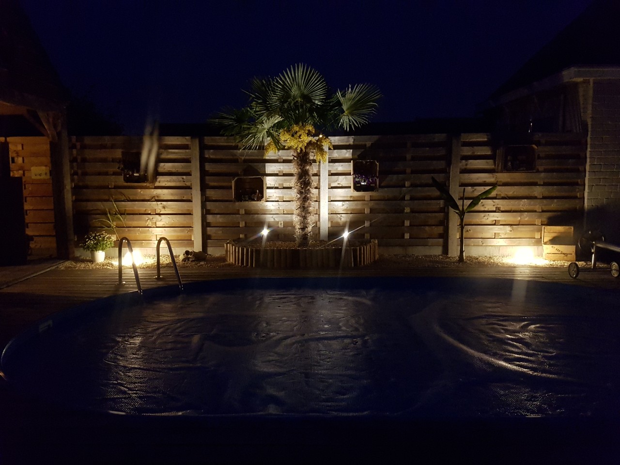 Je kunt de tuingrond (zand of klei) in het ruime plantgat aanvullen en vermengen met potgrond. Potgrond bevat meststoffen maar dat kun je desgewenst aanvullen met koemest of compost. Houdt er rekening mee dat het geruime tijd duurt voordat de palm is aangeslagen en voldoende nieuwe wortels heeft gevormd om zelfstandig te overleven. Als je de palm een cm of 10 dieper zet, kunnen nieuwe wortels uit basis van de stam groeien. Het hoogteverlies wordt snel genoeg door nieuwgroei gecompenseerd. De bescheiden omvang van de kluit betekent dat je de komende maanden nog regelmatig water zult moeten geven. Ook zou ik de palm met 3 tuidraden schoren. Zo te zien heb je een schoon vrouwelijk exemplaar versierd. :thumb_up: