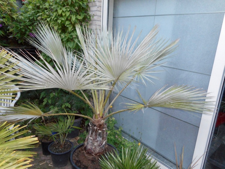 Ik constateer nauwelijks groei bij deze grote Brahea armata. Een kleiner exemplaar dat ik voorheen had, kreeg toch wel enkele nieuwe bladeren per seizoen. Vorig jaar heeft de palm na de winter ongebruikelijk veel blad afgestoten, dat is daarna wel gestabiliseerd. Ik weet niet wat de oorzaak zou kunnen zijn van de geringe groei? Misschien komt het door het koude voorjaar. Ook juni was hier niet bepaald tropisch op een paar dagen na waarbij 25°C of meer werd gehaald. Ik overweeg nu om de palm maar weer terug in de kas te zetten, waar het overdag 5 a 10 graden warmer is. Wat zijn de ervaringen van jullie bezitters van deze palm ?