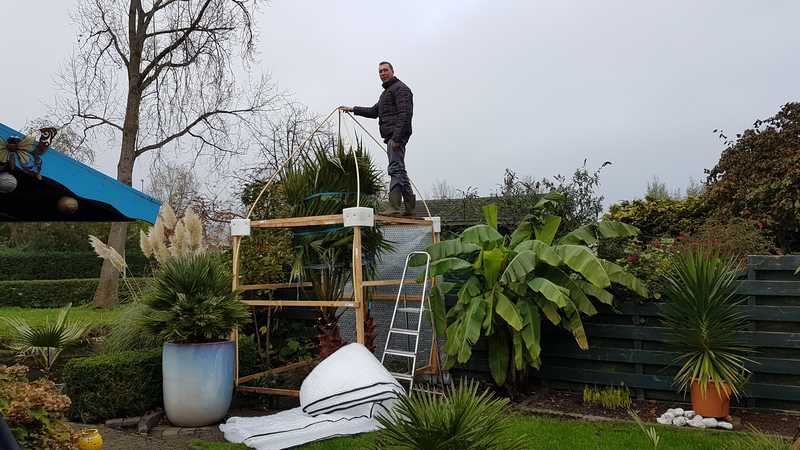 Over (T) paal een plantenhoes. En de stam voorzien van fleasdoek.
