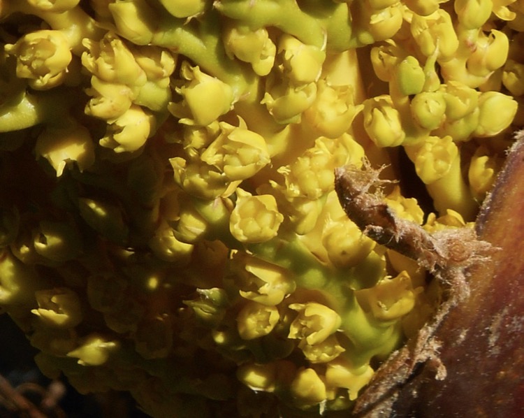 Ik heb een Chamaerops man (Cerifera) en 3 vrouwen. De hierboven afgebeelde humilis is daar een van; de Cerifera vrouw droeg vorig jaar zaad en lijkt dit jaar een pauze te houden. Bij de Cerifera man zijn de onrijpe bloemen nog door de schutbladen omhuld (afb.). Of de stoere zwarte doorns een kenmerk zijn van mannelijkheid, weet ik niet. :lol: En of het klikt tussen partners is afwachten, vorig jaar bleef de bestuiving van de afgbeelde vrouw zonder resultaat.