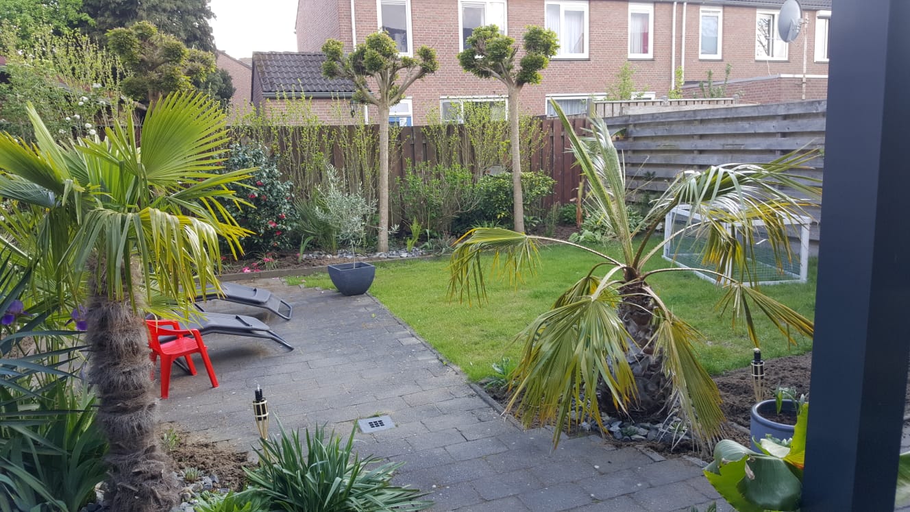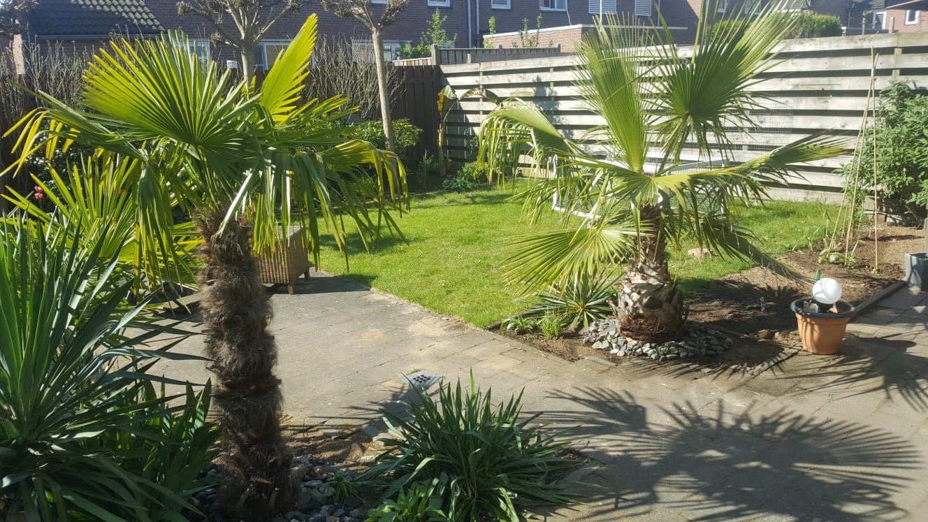 Ik ben sinds een paar jaar bezig met het vertropiseren van mijn tuin. Eind maart heb ik deze washingtonia in de grond gezet, helaas zijn de bladen gaan hangen na het plaatsen. Zelf denk ik dat dit normaal is en dat de palm er makkelijk boven op gaat komen. Aangezien mijn kleinere variant ook slecht tegen verpotten kan. Al ben ik wel benieuwd of dat ook klopt en of ik er iets aan kan doen.