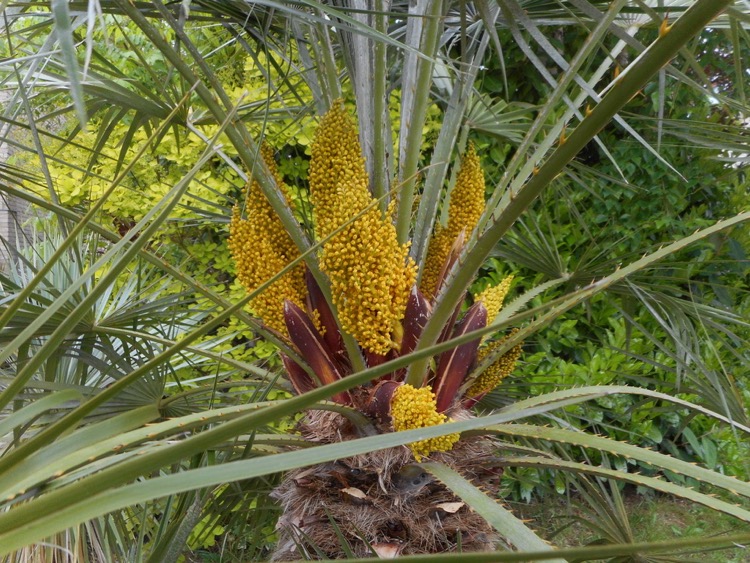 Chamaerops humilis is tweehuizig, je hebt dus mannelijke en vrouwelijke planten. De mannelijke bloemen dragen kortgesteelde gepaarde helmknoppen met het stuifmeel. Het vrouwelijke vruchtbeginsel bevat drie ovaria. Vermoedelijk is dit een vrouwelijke plant. Als je een mannelijk bloeiwijze kunt bemachtigen kun je die erboven hangen. De wind doet de rest.