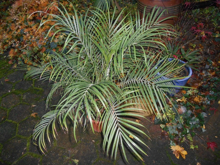 Chamaedorea elegans is een ideale palm voor een plek in de woonkamer zonder direct zonlicht. Deze ijzersterke palm mag in de zomer naar buiten en verdraagt naar mijn ervaring zelfs een temperatuur tot dicht bij het vriespunt. Chamaedorea seifritzii en Chamaedorea metallica vragen meer warmte maar zijn evengoed sterke kamerpalmen. Palmsoorten met leerachtig blad kunnen ook prima in de woonkamer, i.e. Latania lontaroides en Dypsis decaryi. De laatste heeft een grote lichtbehoefte en staat graag in de zomer buiten. Voor een betaalbare maat van de rode latanpalm zie Palmenmann.de. In de woonkamer staan sinds kort Caryota mitis en een grote Dictyosperma album (mypalmshop). Het is afwachten hoe deze nieuwkomer zich de komende winter zal gaan houden? Palmenmann biedt clusters met Dictyosperma. Tenslotte is er nog de aantrekkelijke Phoenix roebelenii dwergpalm die eveneens in de zomer naar buiten kan. Ik trof onlangs een partij jonge planten met 2 à 3 individuen voor slechts € 17 (Almeerplant). Oh ja ik vergeet nog Rhapis excelsa te noemen!