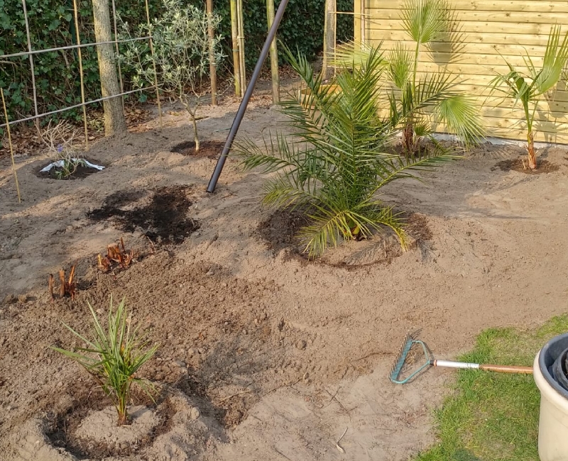 Ik ben hier niet nieuw maar heb nu sinds dik een jaar een eigen stek (15are). Dus in de achterzijde van de achtertuin al veel veranderingen gedaan. Waaronder deze phoenix aangeplant begin April. Ook canna's gingen de grond in, een olijfje, een chilensis,... De kleinere filifera eigen zaailing en grotere 3 stam Robusta van de Aldi ook in de grond. De filifera had al wat vlekken na donderdag -2,9°C in hut 150cm midden in gazon. En -6,5°C op 10cm gazon. Trouwens genoeg toen voor de bladeren van de musa stammen te vellen.