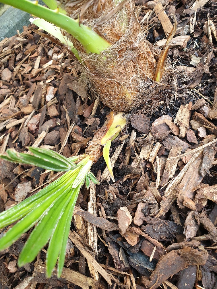 Echter, zoals op de foto is te zien zit geheel aan de onderzijde van de stam een uitstekend stuk (lijkt wel een stekje, al heb ik begrepen dat een palm die niet maakt) waar een blad uit begint te komen.