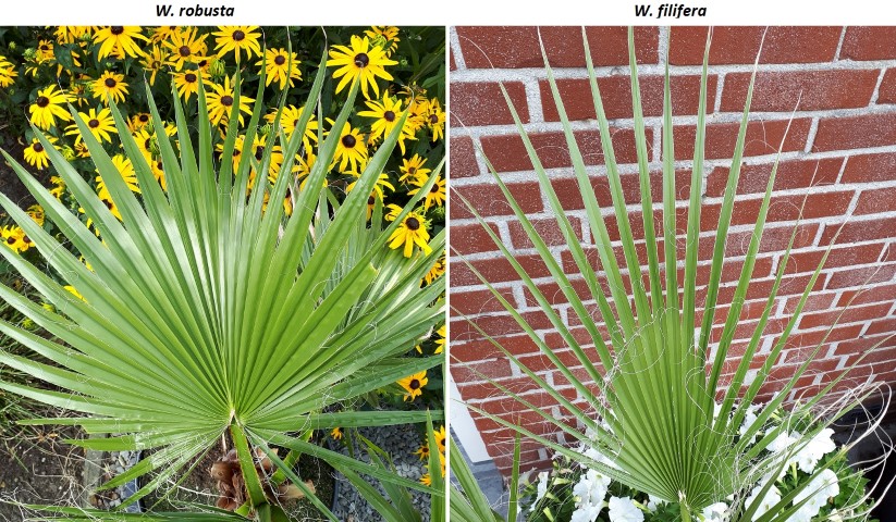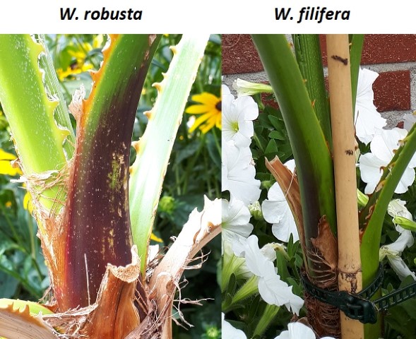 In La Connaissance de Palmiers staat ook een uitgebreide morfologische beschrijving van beide soorten, maar dat vergt wat meer studie gelet op mijn sleetse kennis van de Franse taal. Over de stam staat bij de robusta: 'le stipe et fin, gris, finement crevassé, cylindrique et elancé, de diamètre constant sauf à la base, qui est invariablement renflée'.
