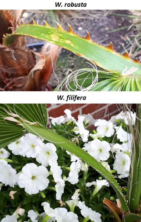 Op basis van deze beschrijving denk ik inderdaad de gezochte filifera te hebben. Ik heb geen vergelijkingsmateriaal (robusta) maar naast de ontbrekende stekels voldoet ook de vorm van de hastula aan de beschrijving van filifera evenals de minder uitgesproken verkleuring van de bladbasis.