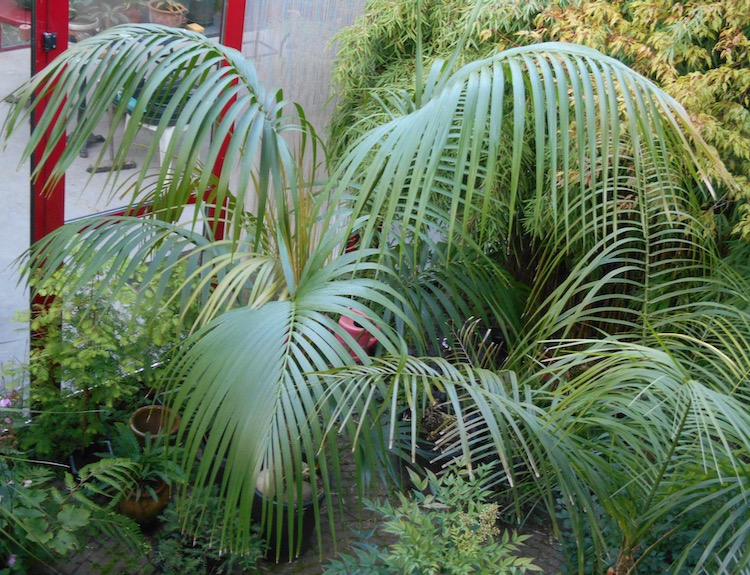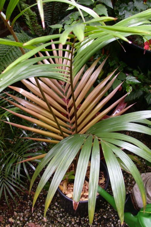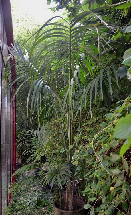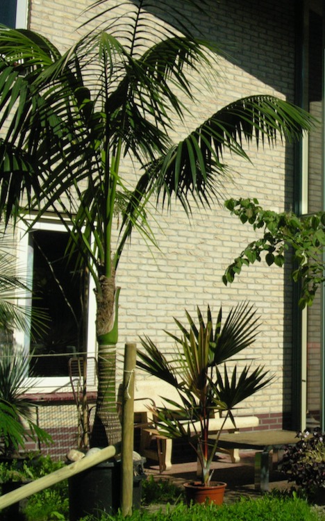 De kentiapalm of Howea forsteriana is waarschijnlijk een van de oudste kamerpalmen. Het is een robuuste soort die al in de 19e eeuw in Europa als kamerplant werd geïntroduceerd toen de huizen steeds beter werden verwarmd en ook minder vochtig waren. Ze vervingen de varens die daarvoor in trek waren als kamerplanten. Ik herinner me deze palm uit mijn jeugd bij mijn grootouders in de meestal onverwarmde voorkamer, voor als er bezoek kwam, gescheiden door glazen schuifdeuren (kamer en suite) van de woon- eetkamer waar overdag de kachel brandde. Door de enorme uitbreiding van het assortiment kamerplanten is deze palm op de achtergrond gedrongen en dat lijkt me een goede aanleiding om deze aantrekkelijke palm weer eens onder de aandacht te brengen. Mijn eerste exemplaar heb ik heel lang gehouden en had na tientallen jaren tenslotte een flinke stam ontwikkeld. Na de verhuizing naar het buitengebied heeft de palm tijdens een van de koudste winter schade opgelopen in de koude kas en is daarvan niet goed hersteld. Die ervaring rijker, haal ik deze palm in de winter naar binnen voor overwintering bij 10 °C. Om het gewicht beheersbaar te houden, verpot ik niet meer wat consequenties heeft voor de groeisnelheid die toch al niet hoog is. Ik mag nu tevreden zijn met een blad of 3 per 24 maanden. De ontplooiing van het nieuwe blad is een spectaculaire gebeurtenis bij vederpalmen. Ik verwacht dat weer binnenkort. Vorige week heb ik ook de naaste verwant van de kentia ontvangen Howea belmoreana die slecht zelden wordt aangeboden. In het assortiment kentia wordt soms een 'rode' variant aangetroffen met roodbruin uitlopend nieuw blad en een purperkleurige bladsteel.