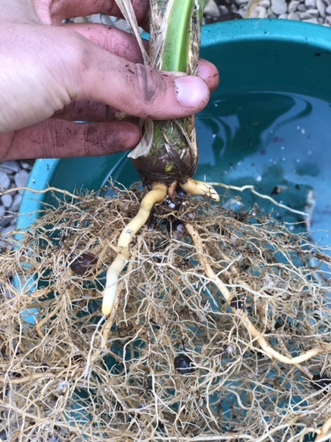 Na het afspoelen van de oude potgrond komt het wortelstelsel tevoorschijn. En dat ziet er prima uit