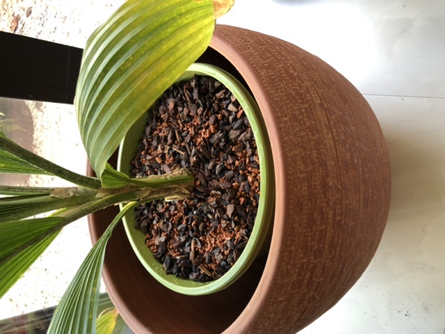 Bij deze enkele foto’s van de transplantatie van mijn Pritchardia Pacifica. Deze is na 1,5 jaar een probleem met necrose beginnen krijgen. Om dit te verhelpen, heb ik hem verplant van een mengeling van potgrond met perliet, naar een mengsel van seramis, fijne denneschors en LECA korrels (2:2:1). Op de bodem van de pot zit nu ook een laag LECA korrels.