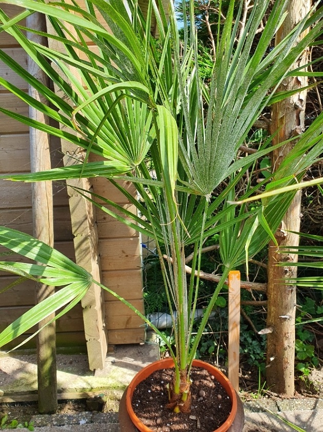Met dat ik dit schrijf heb ik zicht op mijn terras waar aan weerszijde een Chamaerops staat.