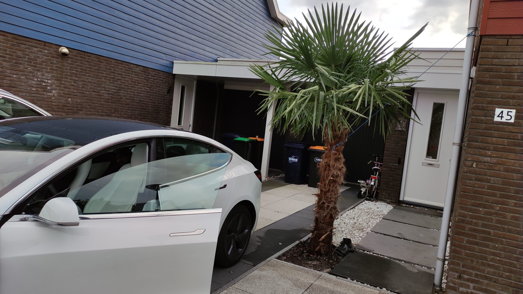 Maar goed, hij zat aan 2 kanten strak tegen een border, vanaf daar hebben we recht omlaag en naar het midden af gestoken. Het was een serieus zwaar gevecht en is uiteindelijk uit de grond met veel meer grond en wortelen dan ik had ingeschat. Wortels zitten aan de palm tot 35 cm onder de stam, hoop dat dit voldoende is.