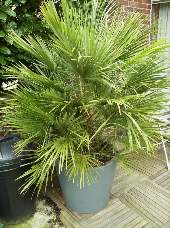 De meeste van onze palmen zijn trage groeiers, sommige waaronder mijn lieveling de Trithrinax Campestris zelfs extreem traag. Een van de beste groeiers hier bij mij is een wat grotere Chamaerops Humilis, ik heb deze plant sinds mei vorige jaar en hij is met success de winter doorgekomen. Aanvankelijk dacht ik, ik zet hem in een pot, dan kan ik hem eventueel een weekje of 2 in de garage zetten als het toch te koud wordt. Maar plant en pot tesamen zijn toch te groot om te verplaatsen. Hij heeft er zo een zin in dat hij zichzelf uit de pot aan het duwen is. Onderstaande foto' s tonen dit aan.
