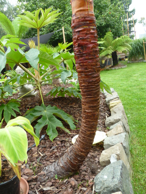 Er stond ook een gestripte Trachycarpus wagnerianus met twee krommingen in de stam. Met de bladresten eraan, ziet dit er niet uit (vind ik), maar gestript was hij bijzonder geslaagd! Ik heb er jammer genoeg geen foto van ...