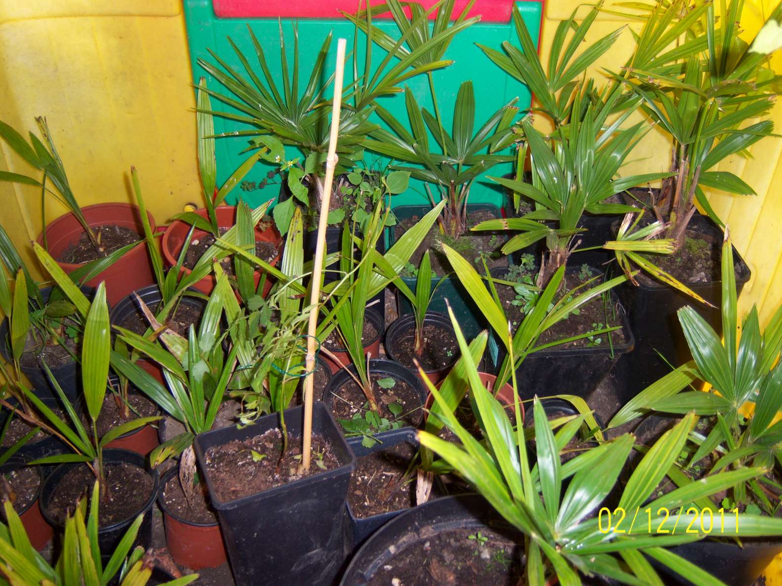 @ Lapalmeraie (Niek) : Deze palmen gaan toch buiten blijven in pot, dus kan ik evengoed eens iets proberen. Vandaag in ieder geval een rotweer, veel wind en regen.