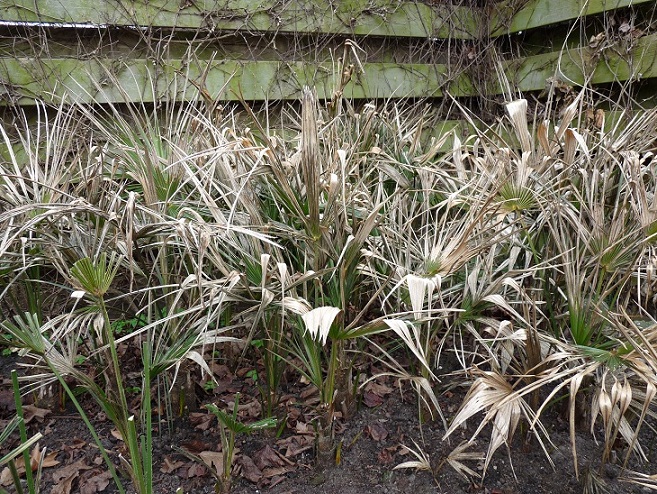 Alle 13 trachycarpus fortunei hebben bladschade. De 2 kleinste hebben speerrot, de andere niet. Van de 3 hoogste (meter of 6) hebben we nog niet aan de speer getrokken, maar deze hoge trachy's hebben zeer zeker de meeste bladschade.