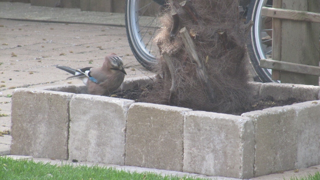 Op foto's zijn vlaamse gaaien in aktie, waarschijnlijk gebruiken ze de draden van de stam voor het bouwen van hun nest. Er is ook al een stelletje eksters en een duif aan de satm aan het trekken geweest. Ik laat het maar zo, zo krijgt een uitheemse boom een inheemse funktie en weet de fauna de trachy te waarderen. :shock: