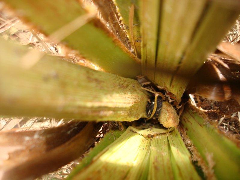 Hij schiet nu vrij traag uit, en zijn levenskruin begint ook gelig te zien, hij voelt echter nog altijd vast aan. Toen ik die kruin wat probeerde open te krijgen zag ik dat er een slak en pissebedden inzaten. Ook zat er een kleine zwarte smurie in. Slak is er nu uitgehaald maar ik weet niet of deze de plant aan het eten was of luizen.