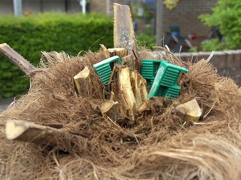 Ik denk overigens niet dat het een nieuwe methode is, wij stonden met de zaag in de hand toen ik dat kleine puntje onderin ontdekte. Misschien het enige dat wel anders is, zijn de stukjes plastic om de speer lucht te geven om te drogen. Maar ik geef je gelijk, het ziet eruit alsof de palmendokter op huisbezoek is geweest!